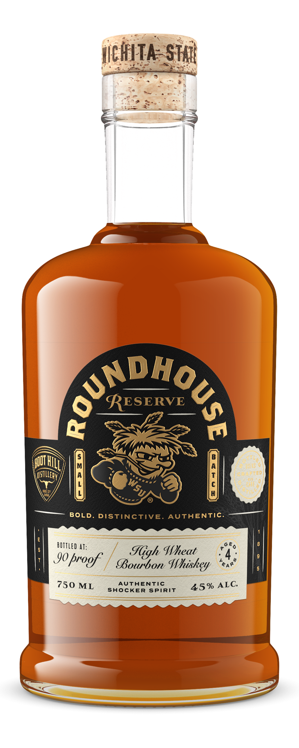 Roundhouse Reserve Bourbon is a locally made whiskey crafted with Kansas-grown grains in partnership with WSU. Aged in new charred oak barrels, this well-balanced wheated bourbon brings together Wichita State's historic wheat branding with the craftsmanship of a local farmer owned distillery to create a standout product that offers strong local connections and exceptional quality for every Shocker fan and alum.